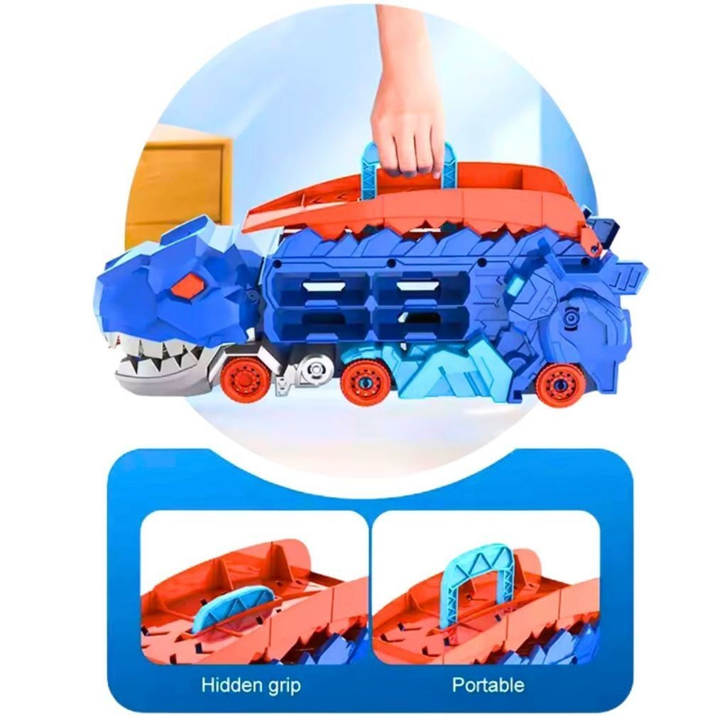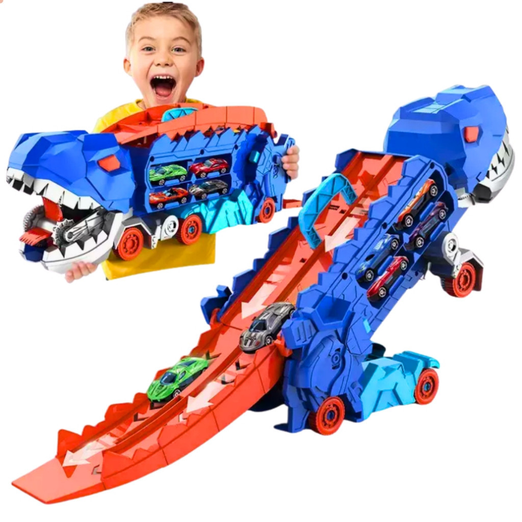 O Caminhão 3 em 1 Dinossauro T-Rex Ultimate reúne pista de corrida, maleta organizadora e caminhão cegonha, garantindo diversão triplicada e desenvolvimento das habilidades da criança.